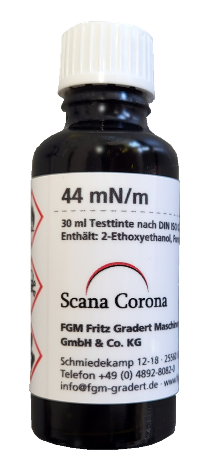 [Ermittlung der Oberflächenspannung per Tintenstrich bei BOPP, hier Ergebnis ≥46 mN/m]