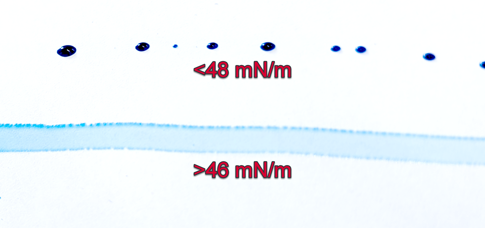 Folgend ein Versuch mit Testtinten der Werte 46 und 48 mN/m: