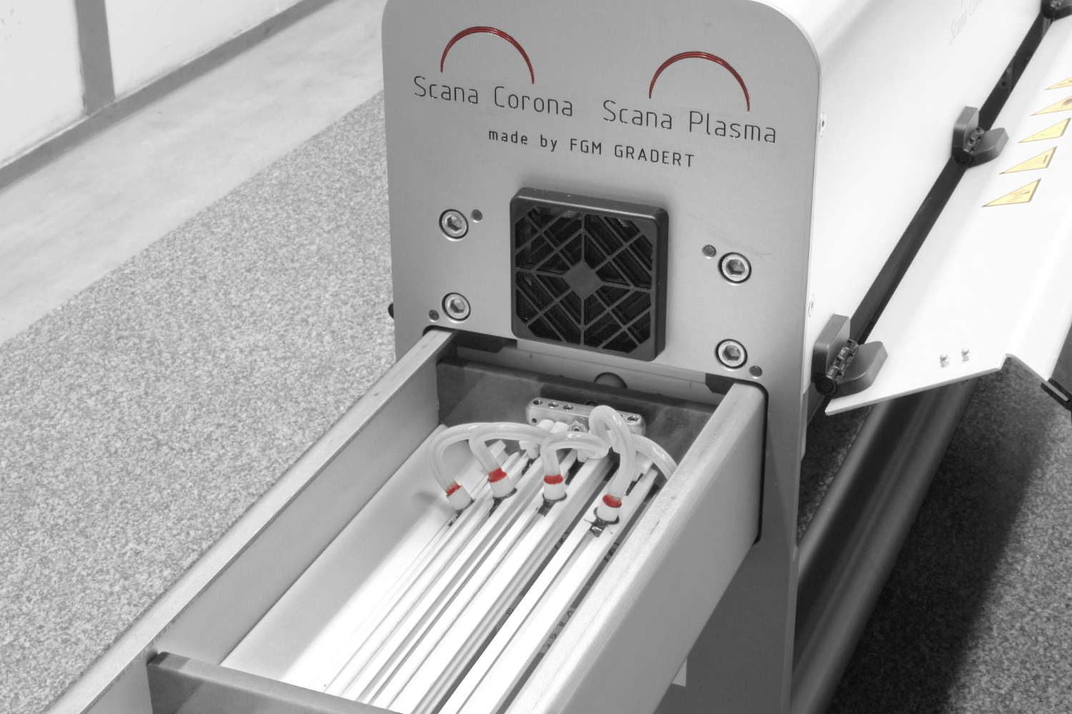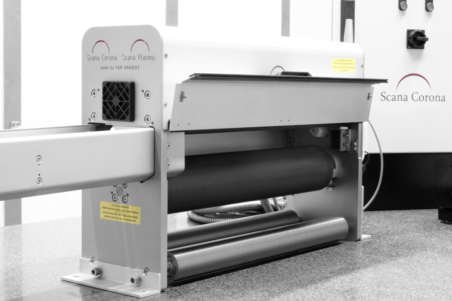 SCANA CORONA verwendet breite Keramik- und Metallelektroden. Die Verweilzeit des Materials unter den Entladeelektroden in Laufrichtung ist lang.